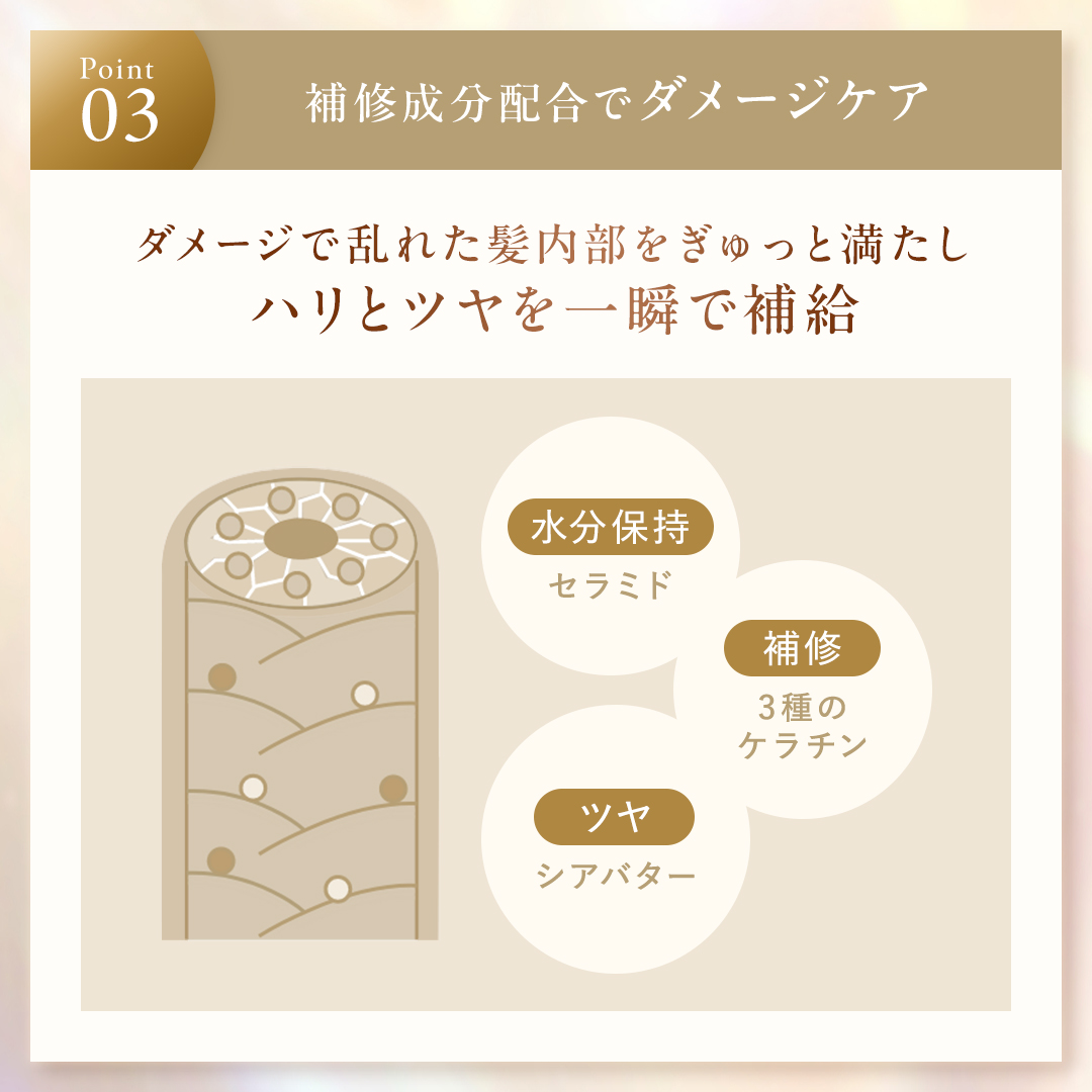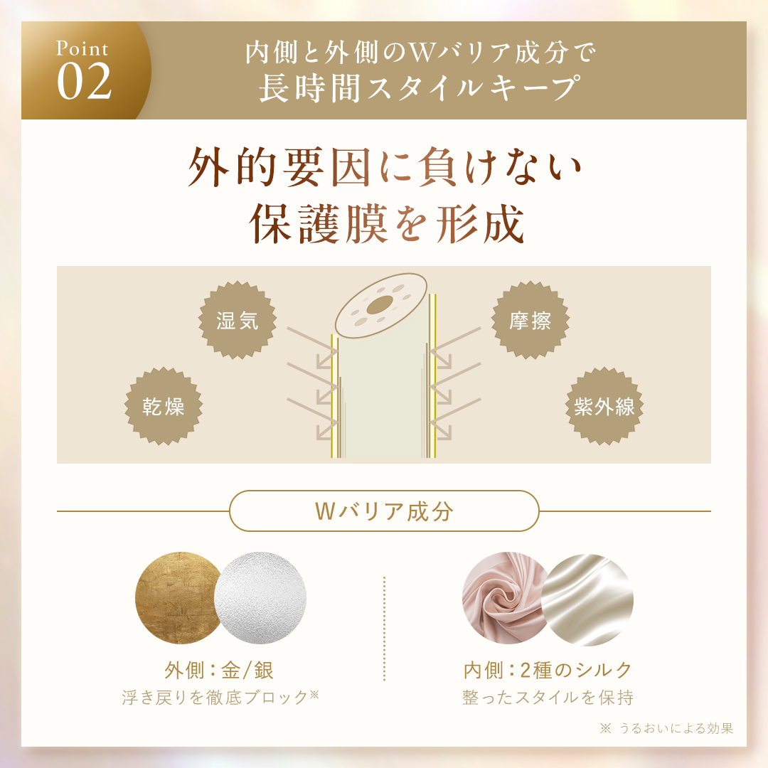 髪の内側と外側のWバリア形成で、湿気や乾燥をブロックし、しなやかな質感をキープ。
