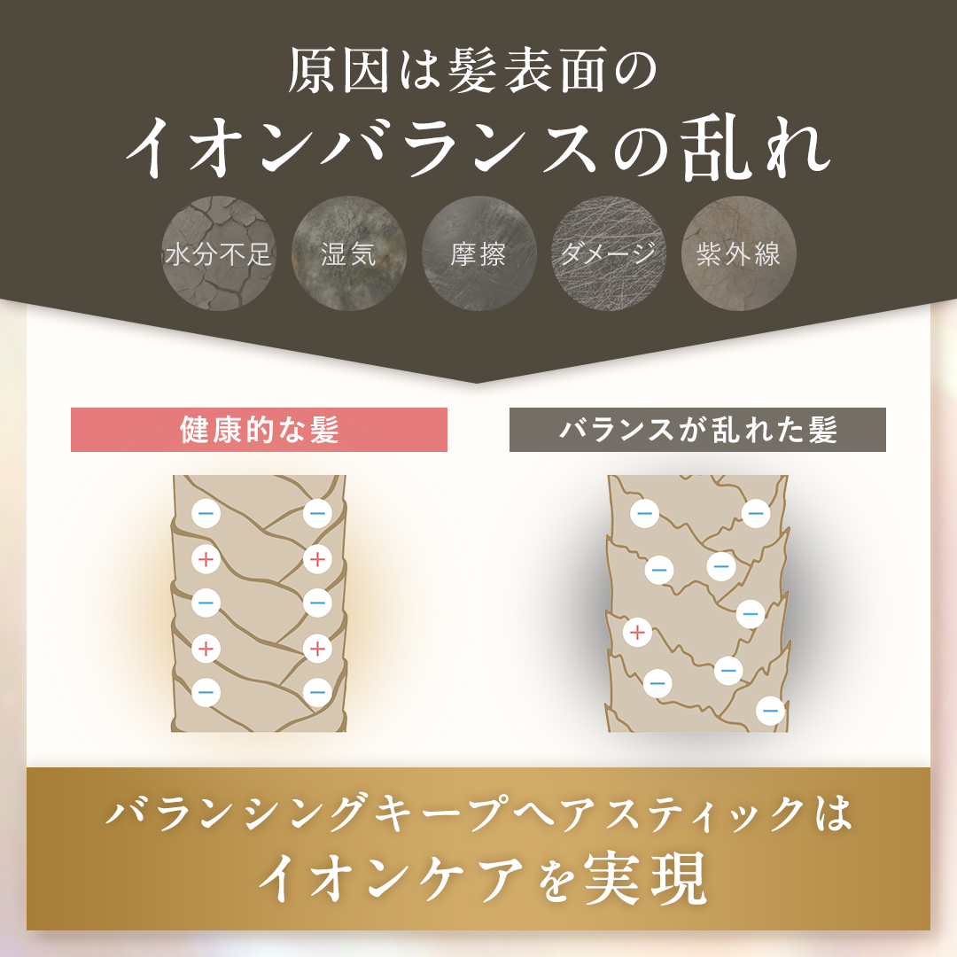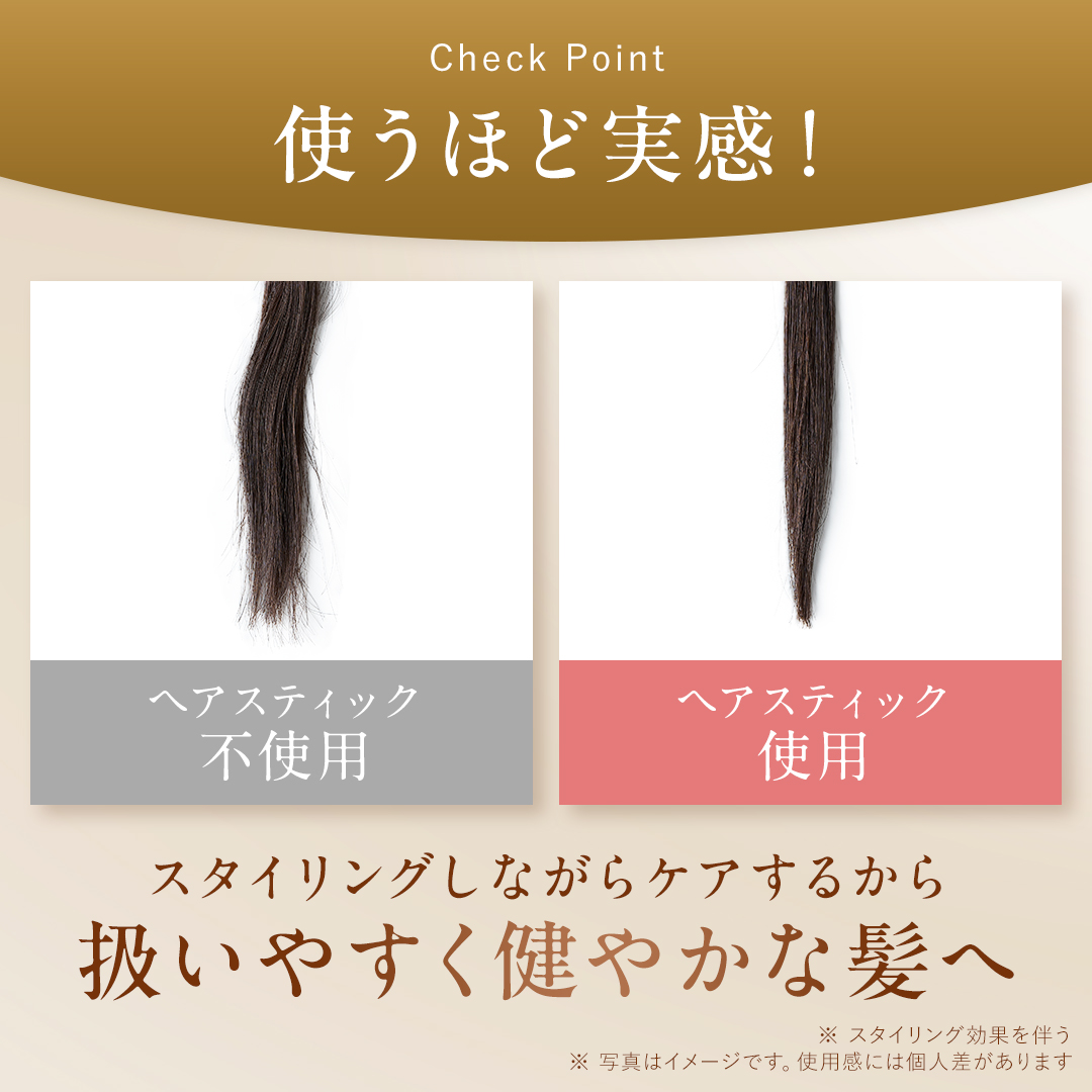 浮き毛や、前髪のうねり、パサつきを抑える スタイリングヘアスティック。独自のイオンケア キープ設計で髪の表面を整え、固めずに理想 の形をキープ。さらに、ダメージで乱れた髪 内部を満たす補修成分配合。至近距離でも美 しい、完璧な仕上がりを完成させます。
