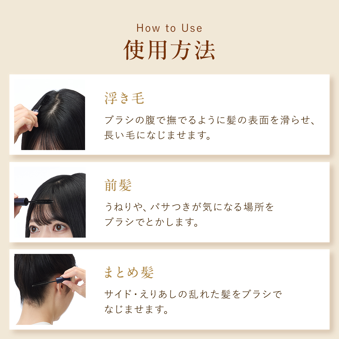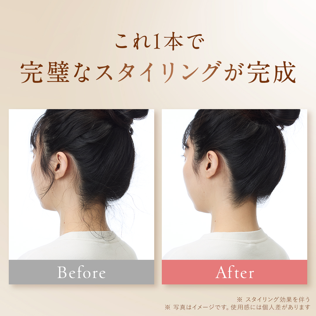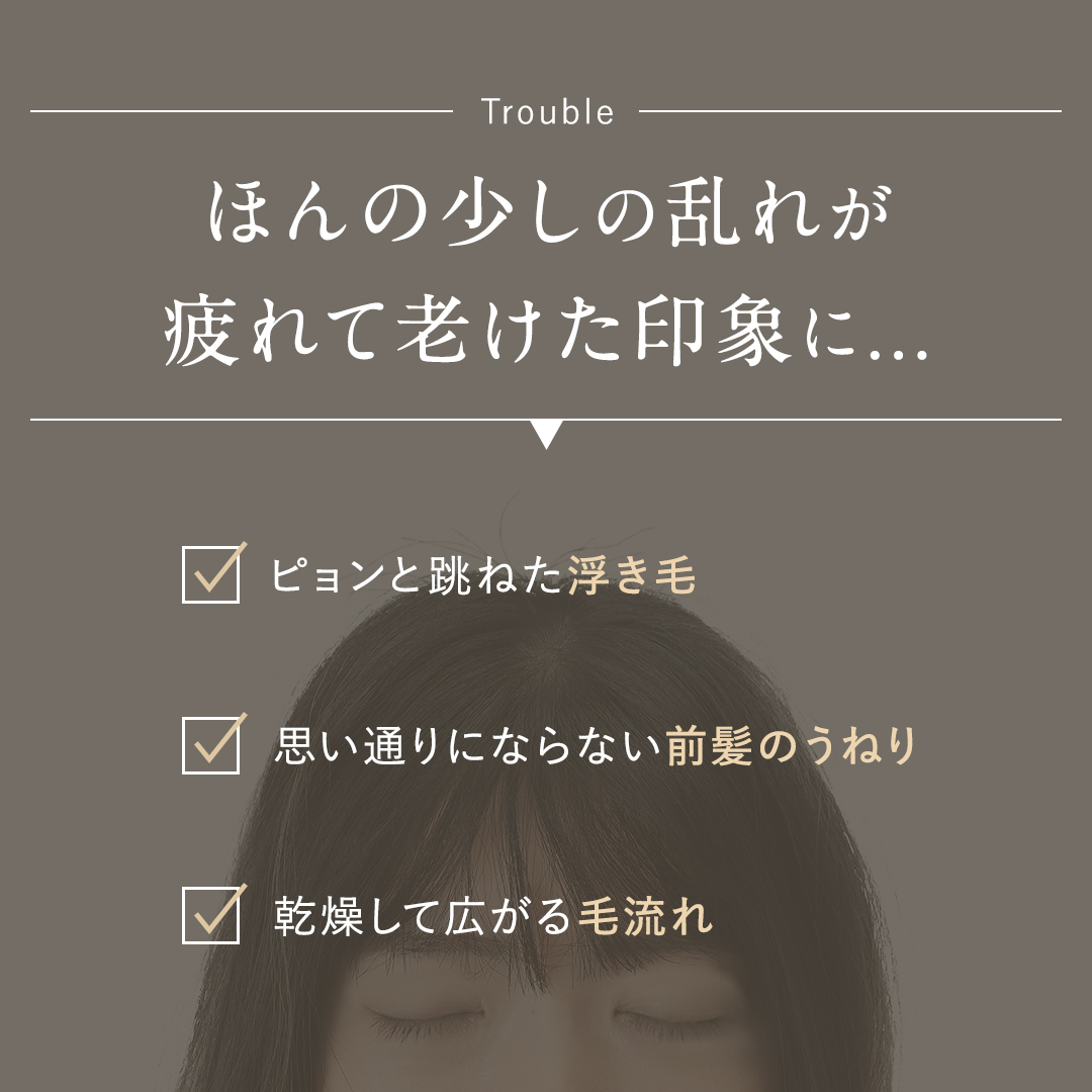 - 浮き毛、前髪のうねり、パサつき、おくれ毛など、気になる部分に幅広くお使いいただけます。乱れた毛流れを瞬時に整え、ヘアスタイルを美しく仕上げます。
