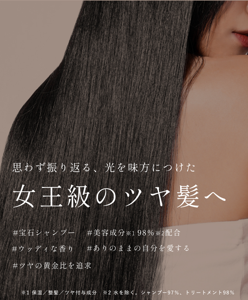 クレオパトラが愛した美容成分※配合。独自の「3Dリフレクション設計」でダメージを芯まで補修し、息をのむ「女王級ツヤ髪」へ導く宝石シャンプー。パサつき・うねり・広がりを抑えます。