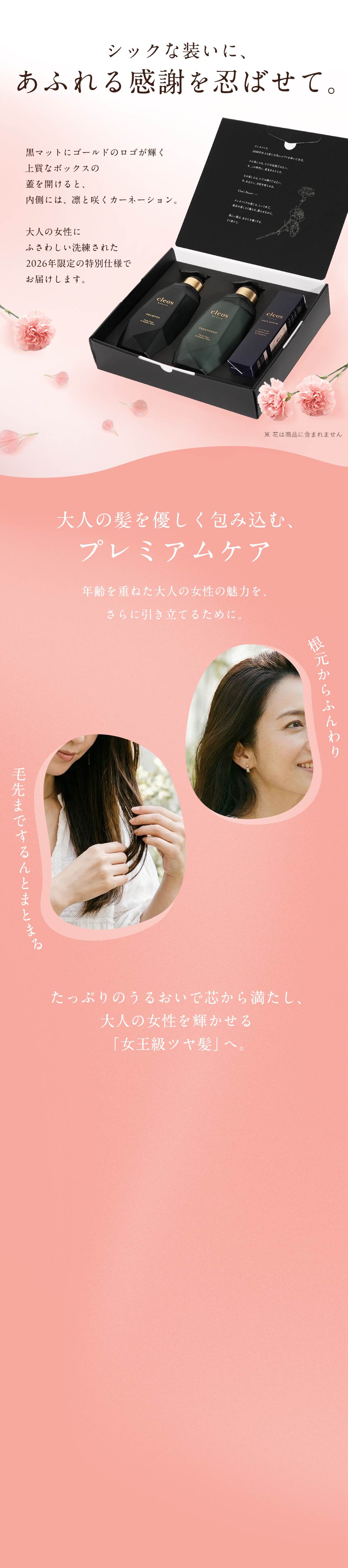 ブランドを代表するヘアケア3点が揃った、母の日限定のラインナップ。「洗う・定着・閉じ込める」の3層アプローチで、一日中美しいツヤをキープします。感謝を伝える贈り物としてはもちろん、毎日頑張るご自身へのご褒美にも最適な上質なセットです。