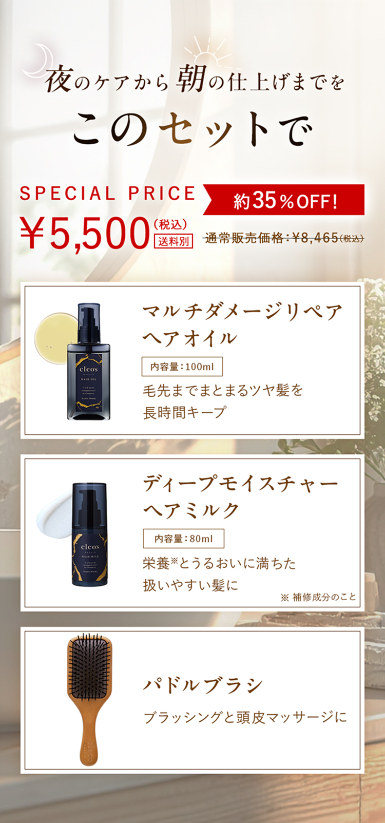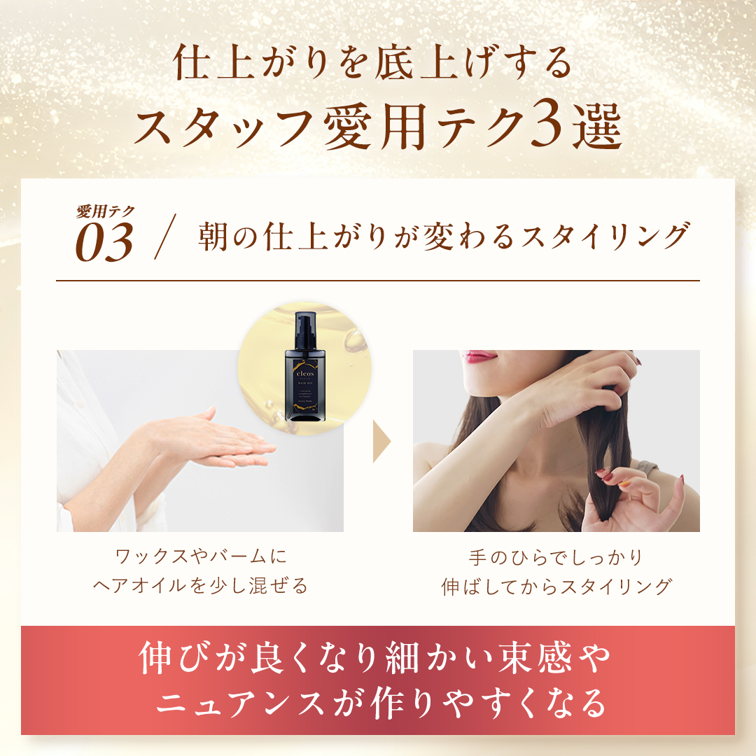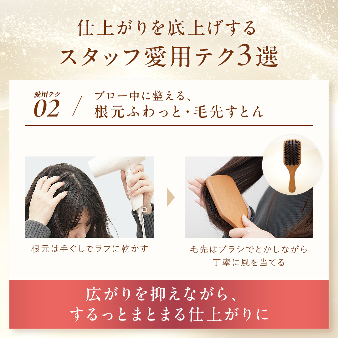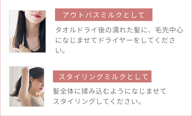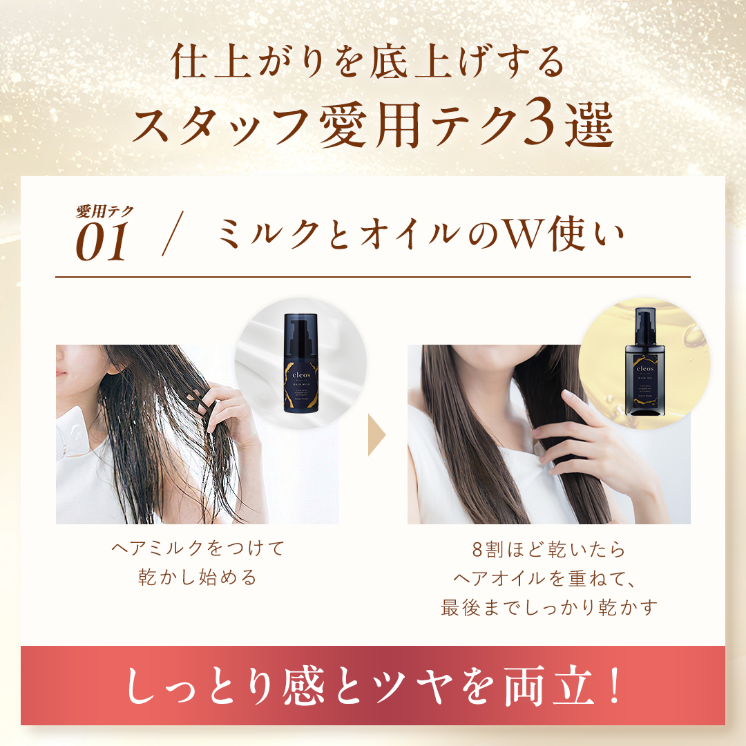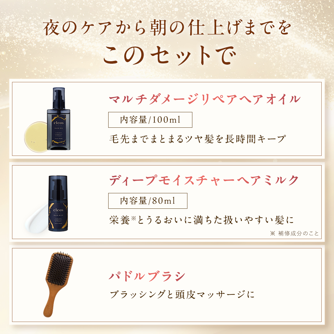 お風呂上がりのケアから、朝のスタイリングまで使える3点セットです。 ミルクでうるおいを与え、オイルでツヤを重ね、パドルブラシで毛流れを整えることで、乾かす時間がより心地よく、スタイリングもしやすい髪へ。 毎日使いのアウトバスコレクションです。